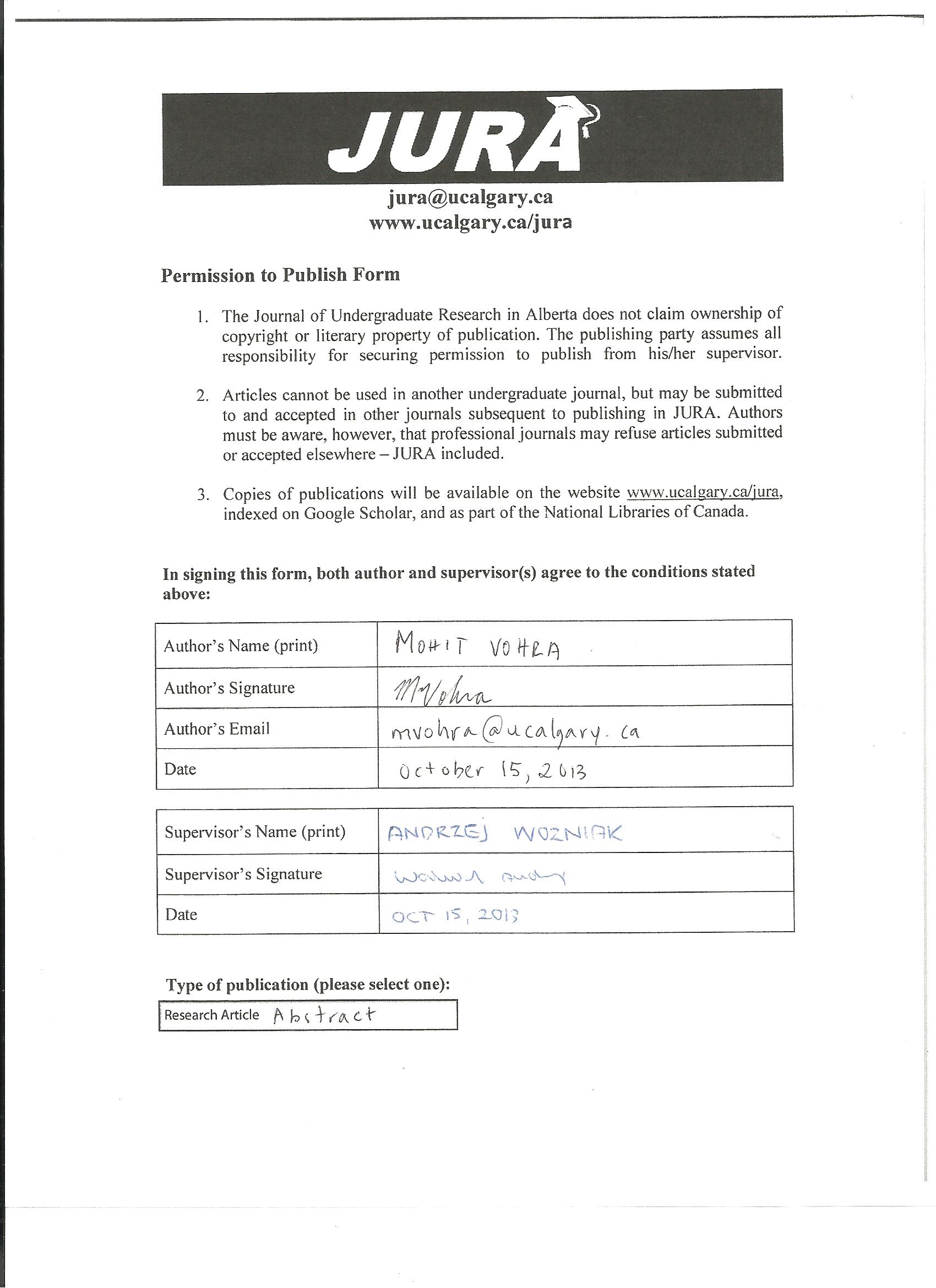 Authors retain all rights to their research work. Articles may be submitted to and accepted in other journals subsequent to publishing in JURA. Our only condition is that articles cannot be used in another undergraduate journal. Authors must be aware, however, that professional journals may refuse articles submitted or accepted elsewhere—JURA included.