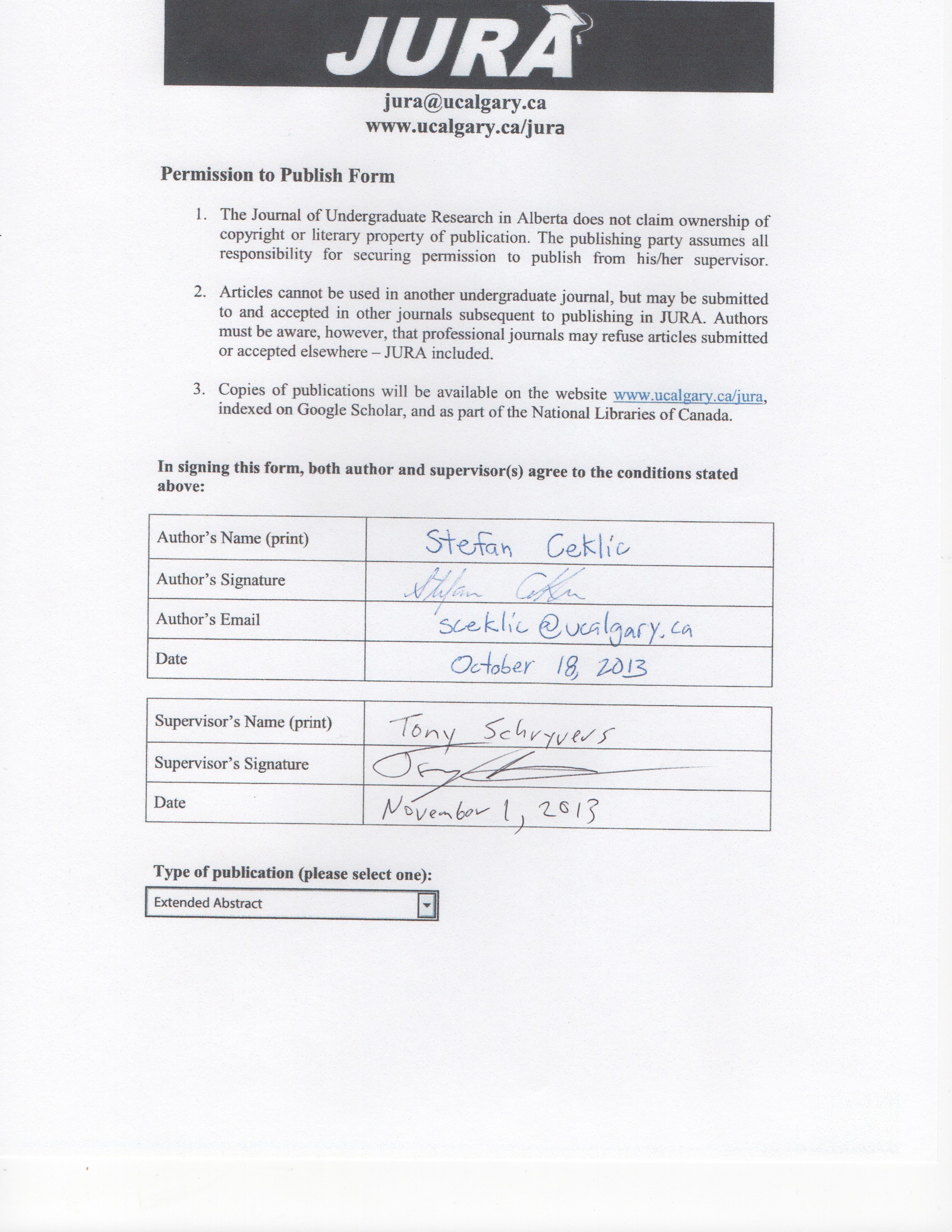 Authors retain all rights to their research work. Articles may be submitted to and accepted in other journals subsequent to publishing in JURA. Our only condition is that articles cannot be used in another undergraduate journal. Authors must be aware, however, that professional journals may refuse articles submitted or accepted elsewhere—JURA included.
