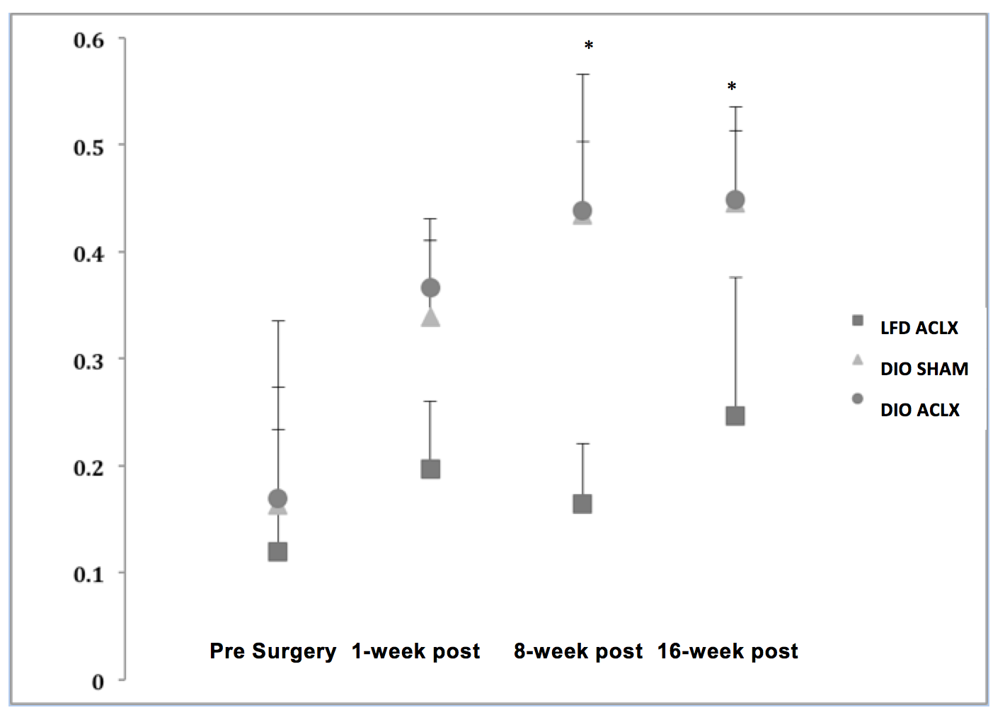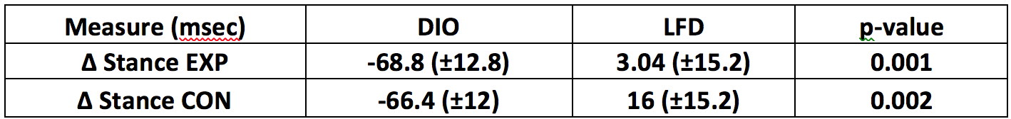 Introduction: Obesity is considered a risk factor for both the onset and progression of osteoarthritis (OA). Obesity, OA and mechanical perturbation have all been identified individually to increase gait asymmetry. The purpose of this study was to assess the effect of obesity on the progression of gait asymmetry as a component of a diet induced obesity (DIO) OA model in the presence of mechanical perturbation. Methods: 28 Sprague Dawley Rats were assigned to a high fat, high sucrose diet or a low fat diet group (LFD). Twelve weeks post DIO groups receive an anterior cruciate ligament transection (ACL-X), or sham surgery. Pre-surgery, 1-week, 8-week, and 16-weeks post-surgery, kinetic data were collected by 3-D force plate analysis. Peak vertical ground reaction force (pVGRF), vertical impulse, and stance times were quantified then compared between limbs to quantify an asymmetry index (AI). Results: There were no differences in normalized pVGRF AI between hind limbs in the DIO or LFD group animals. Stance times decreased for both hind limbs in both DIO group animals. DIO ACL-X group animals had a greater AI compared to LFD group animals at 1-week post-surgery, and both DIO group animals had greater AI at 8 and 16 weeks post-surgery, compared to LFD group animals. Conclusion: DIO group animals exhibited gait patterns with increased asymmetries compared to LFD group animals, regardless of presence or absence of mechanical perturbation, suggesting that obesity causes distinct changes in gait patterns accelerating the onset and progression of knee osteoarthritis.References