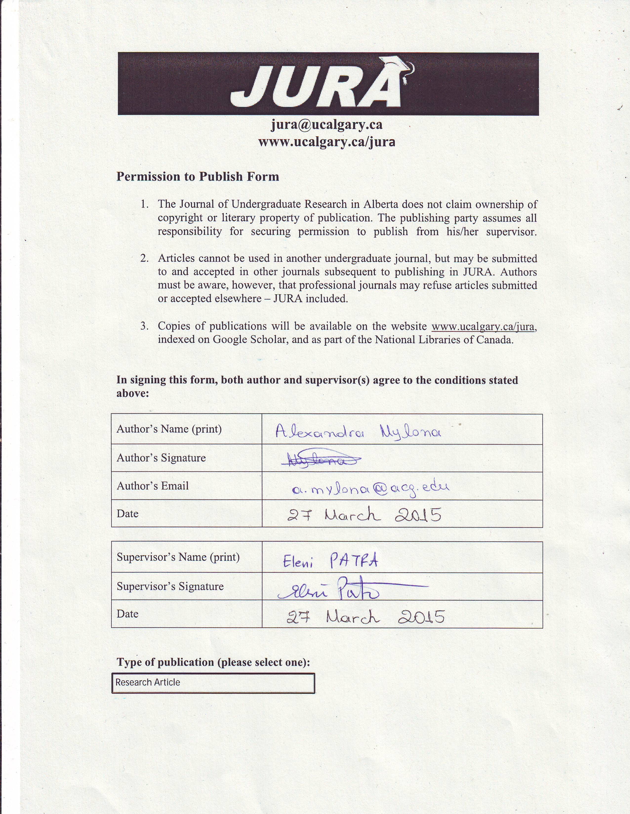 Authors retain all rights to their research work. Articles may be submitted to and accepted in other journals subsequent to publishing in JURA. Our only condition is that articles cannot be used in another undergraduate journal. Authors must be aware, however, that professional journals may refuse articles submitted or accepted elsewhere—JURA included.